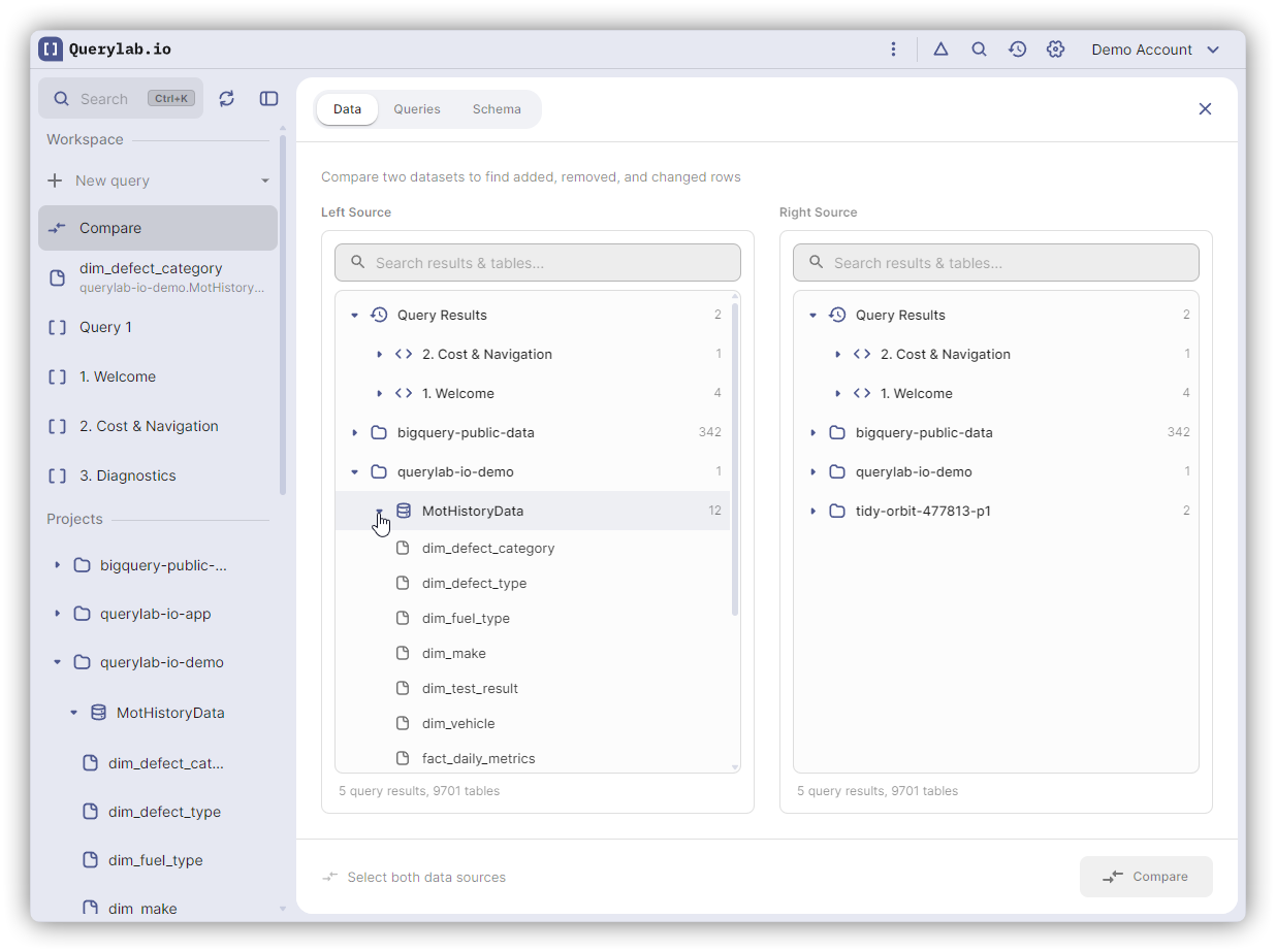 For SQL-based comparisons, Querylab.io shows estimated bytes and cost before running: