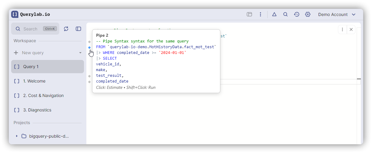 Pipe syntax works with Partial Execution - each |> shows a gutter icon. Shift+Click any pipe operator to execute up to that stage and inspect intermediate results.