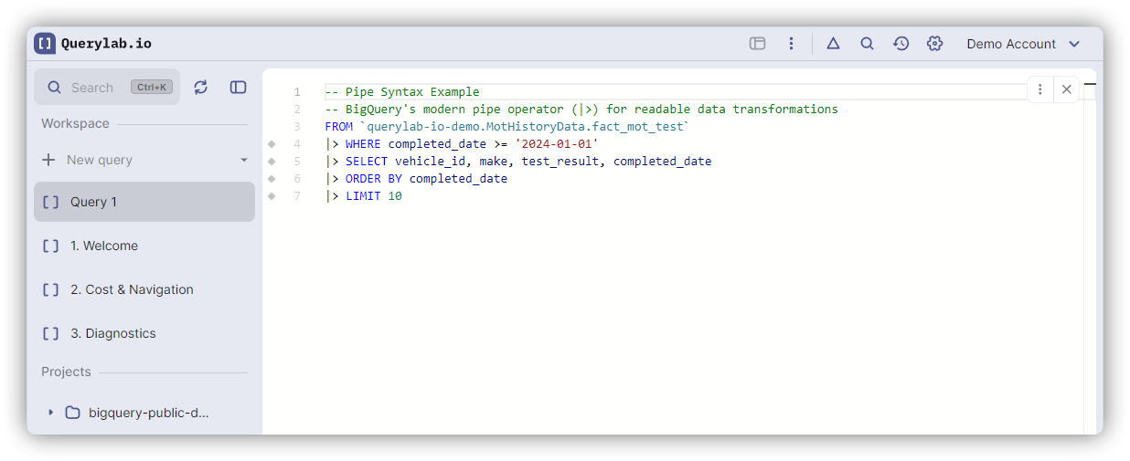 Pipe syntax reads top-to-bottom in execution order.